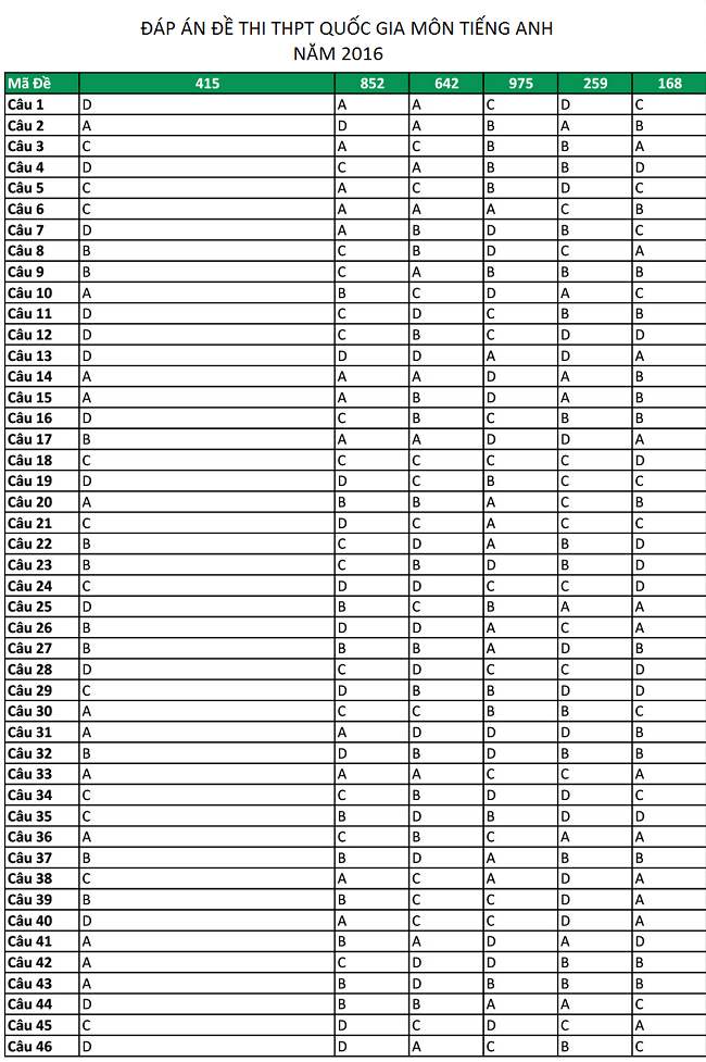 Đáp án đề thi THPT quốc gia môn Tiếng Anh năm 2016
