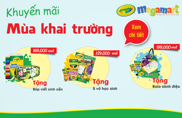 Chào năm học mới thật vui với bút màu CrayolaNhững chiếc bút chì màu Crayola đã trở nên quen thuộc và không thể thiếu với các em nhỏ bởi thương hiệu Crayola đã khẳng định chất lượng và sự an toàn tuyệt đối đối với trẻ em Việt Nam. Sắp tựu trường rồi, còn gì tuyệt vời hơn khi bé được bố mẹ tặng cho những bộ bút màu Crayola hấp dẫn và còn nhận thêm những quà tặng có giá trị hấp dẫn đặc biệt tại Megamart. Với chương tri Chương trình khuyến mãi Chào năm học mới thật vui với bút màu Crayola tại Megamart áp dụng cho tất cả...10/09/2015