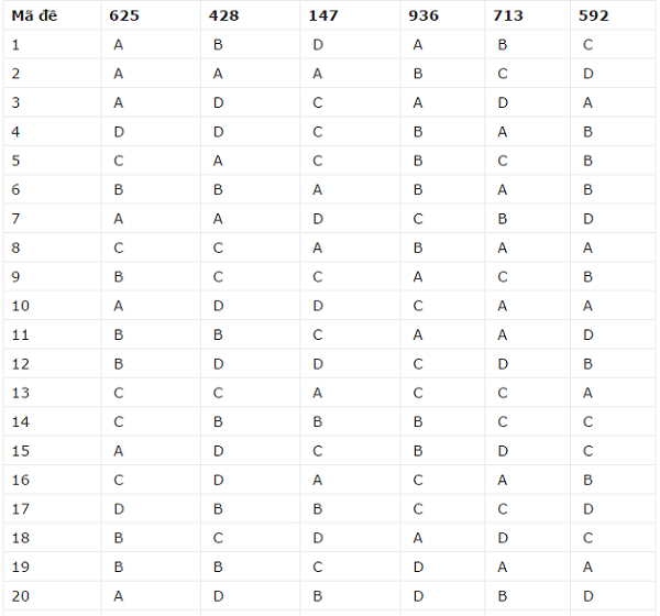 Dưới đây là đáp án theo các mã đề để tham khảo: