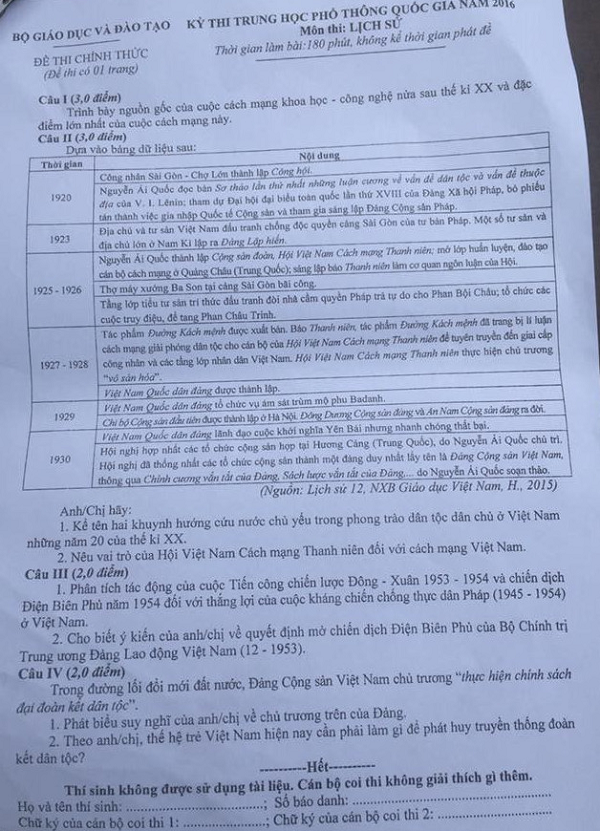 Đề thi THPT quốc gia môn Lịch Sử năm 2016
