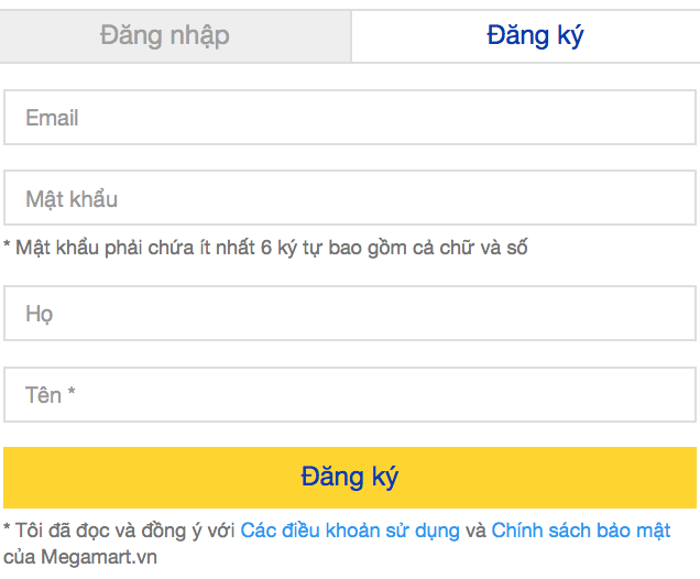 Quý khách vui lòng Đăng nhập bằng tài khoản đã có ở Megamart hoặc đăng nhập thông qua Facebook, Google. Trong trường hợp chưa đăng ký tài khoản, quý khách có thể chọn dòng "Đăng ký" và bắt đầu nhập địa chỉ email, mật khẩu tùy ý để đăng ký tài khoản.