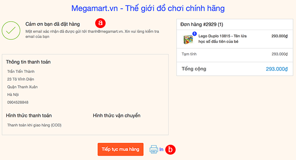 a. Sau khi hoàn tất các bước đặt mua, hệ thống sẽ gửi đến mail Quý khách đăng ký mua hàng thông tin đơn hàng chi tiết