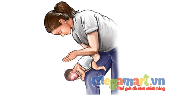Và cần chú ý là nếu trẻ bị sặc mà vẫn có thể nói hoặc ho được, tức là biểu hiện tắc thở không hoàn toàn thì bố mẹ không áp dụng phương pháp này sẽ làm cho bé hoàn toàn bị tắc thở. Với phương pháp vỗ lưng, người lớn đặt trẻ chú ý đặt dọc theo cánh tay của người lớn, đầu trẻ đặt thấp. Người thực hiện cấp cứu đặt tay lên đùi mình, bàn tay giữ vào cằm trẻ sao cho đường thở của trẻ được mở rộng liên tục. Đồng thời dùng gót bàn tay để vỗ lưng trẻ 5 lần liên tiếp. Nếu vỗ lưng không hiệu quả, lật ngược người trẻ lại và đặt trẻ nằm dọc trên đùi người thực hiện và vẫn ở tư thế cúi đầu thấp, ấn ngực 5 lần liên tiếp ở ½ phần dưới xương ức của trẻ.
